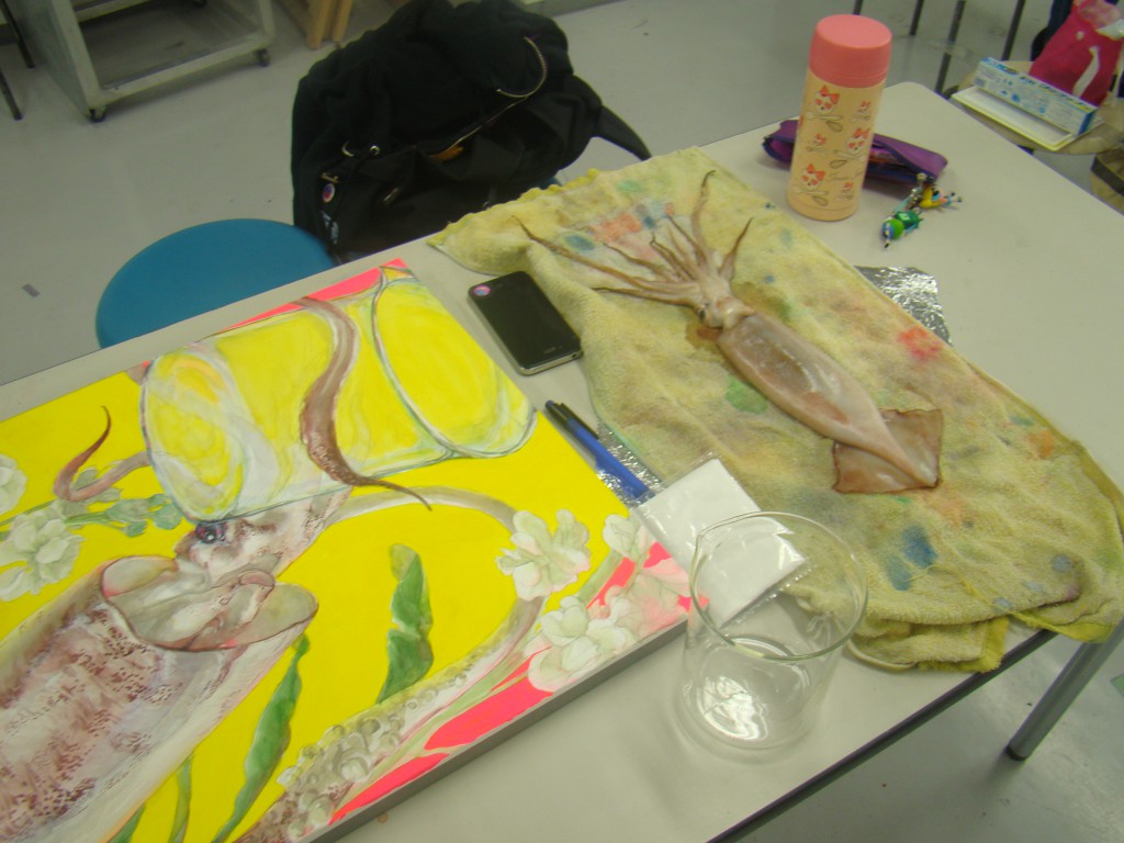 日本画の着彩は、二日間(計11時間)かけて描き上げる持久戦ですが、のんびりしているとすぐに時間がなくなってしまいます。描き出す前のイメージと戦略、それをやり切る根性、両方を兼ね備えないと完成させることができない課題だなあと、つくづく思います。