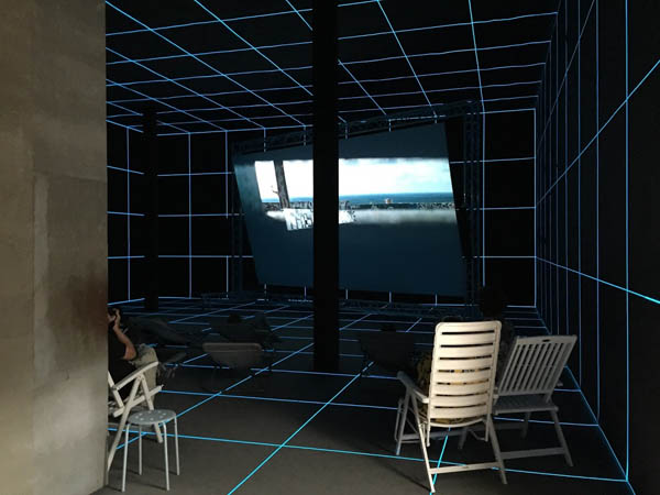 続きましてこちらドイツ館。ドイツ館はグループショーでしたが、なかでも今年のベネチアの注目株のひとり、ヒト・シュタイエルの映像インスタレーション。会場全体に青いレーザーの格子が走っていて、さながら3Dキャプチャのラボみたいな雰囲気。映像も、架空のゲームをモチーフにしていて、夢か現実かわからなくなる仕掛けが徹底しています。なんじゃこりゃ!!