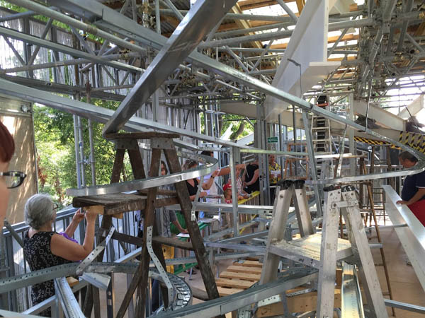 これはベルギー館からジェームス・ベケットの作品。若手です。これまた写真じゃ分からないですが、後ろの棚に整然と並んでるのは、石です。地名や番号が刻まれてるので、石版みたいなやつです。これがなんと、全自動石版順番に並べるマシーンによって、手前のテーブルに並べられては片付けられていきます。なんだこのハイクオリティは。、