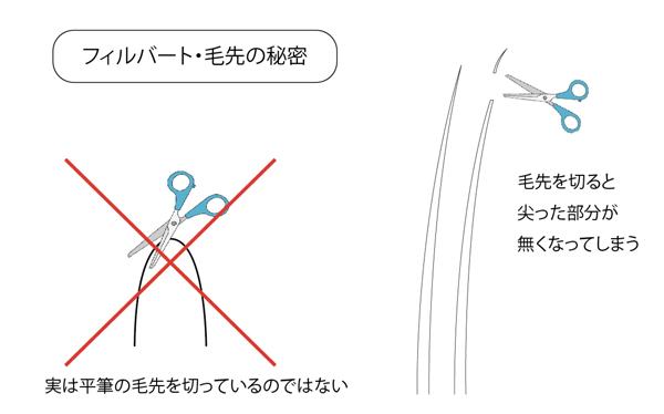 ちなみに筆の形で「フィルバート」と言われているものは、中央部分が端よりも長くなっているのですが、実は毛先をハサミなどで切っているのではありません。