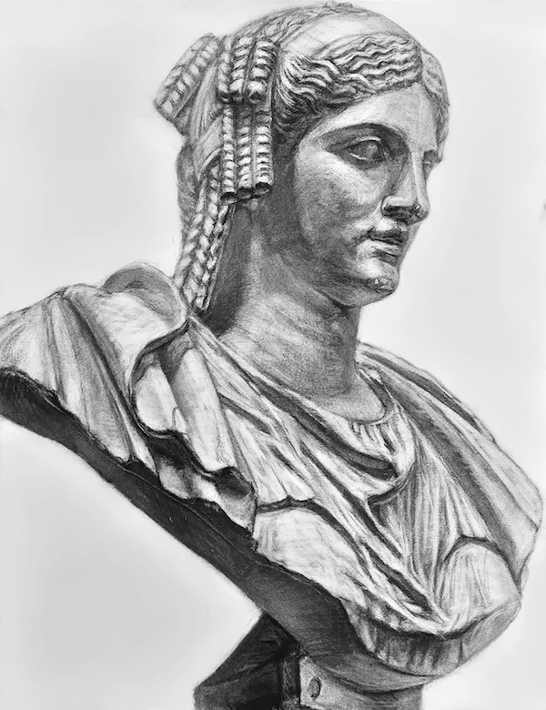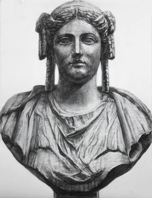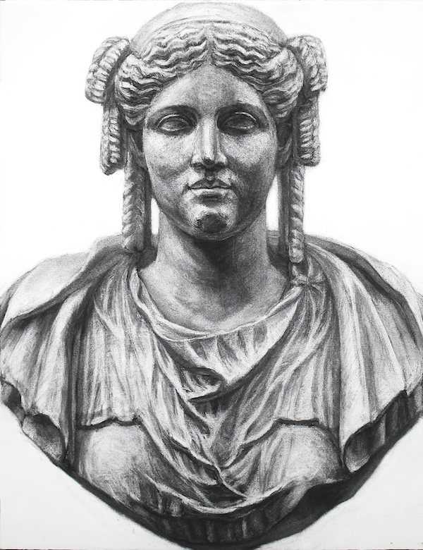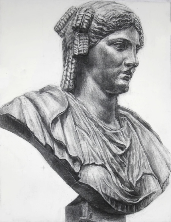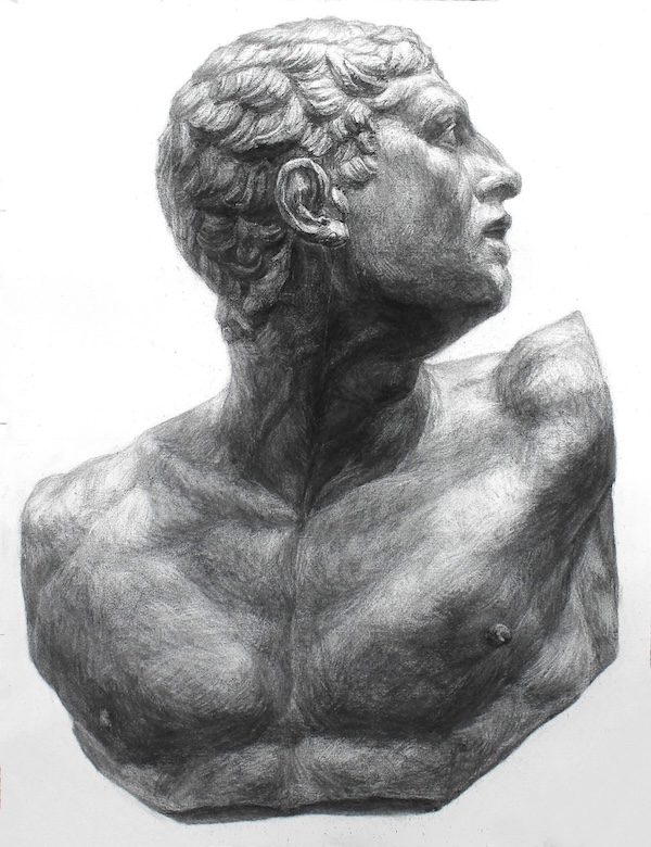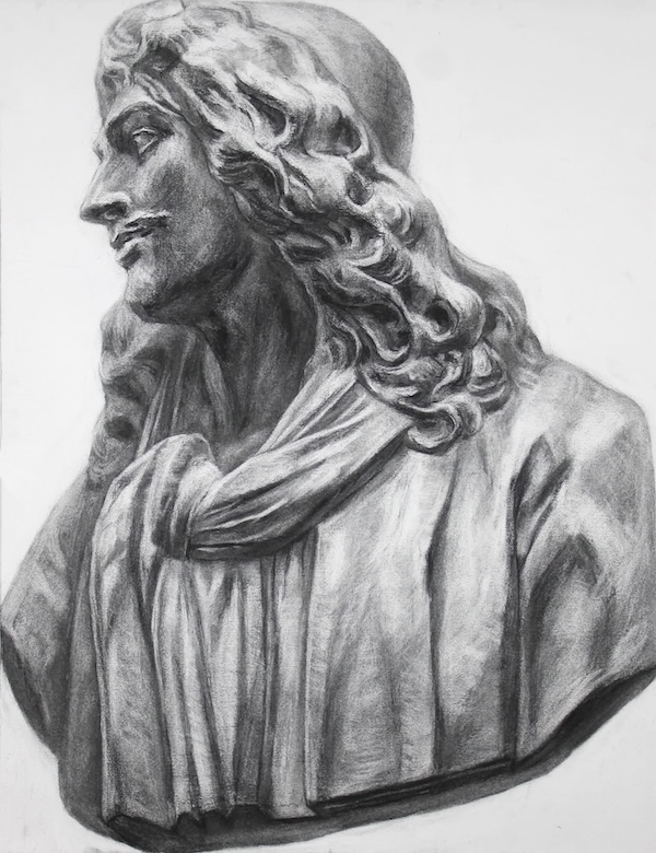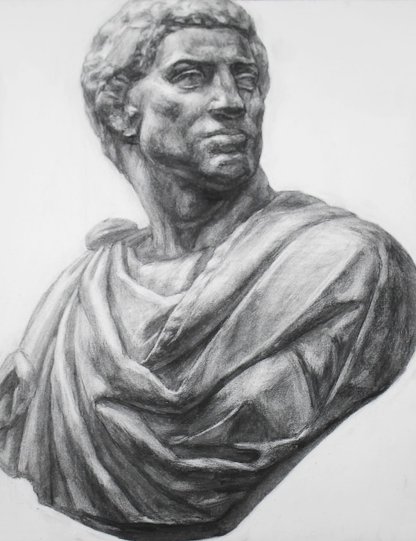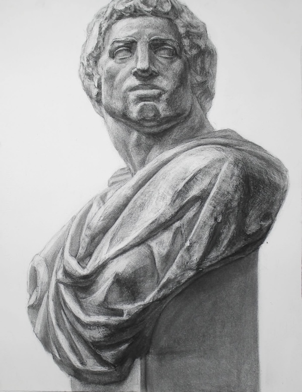素晴らしい出来です。隅々にまで密度を感じます。このデッサンを見て立体を作れるぐらい絵から形を感じます。このデッサンについては特にいうことがないです。最近見てて思うのは、下地作りが甘いと空間も形も表現しきれず終わってしまうと思います。出だしでハイライトを広い範囲で残しすぎない事、陰側に一度に一気にではなくても良いのでしっかりと炭を乗せ切る事が大事かなと思います。