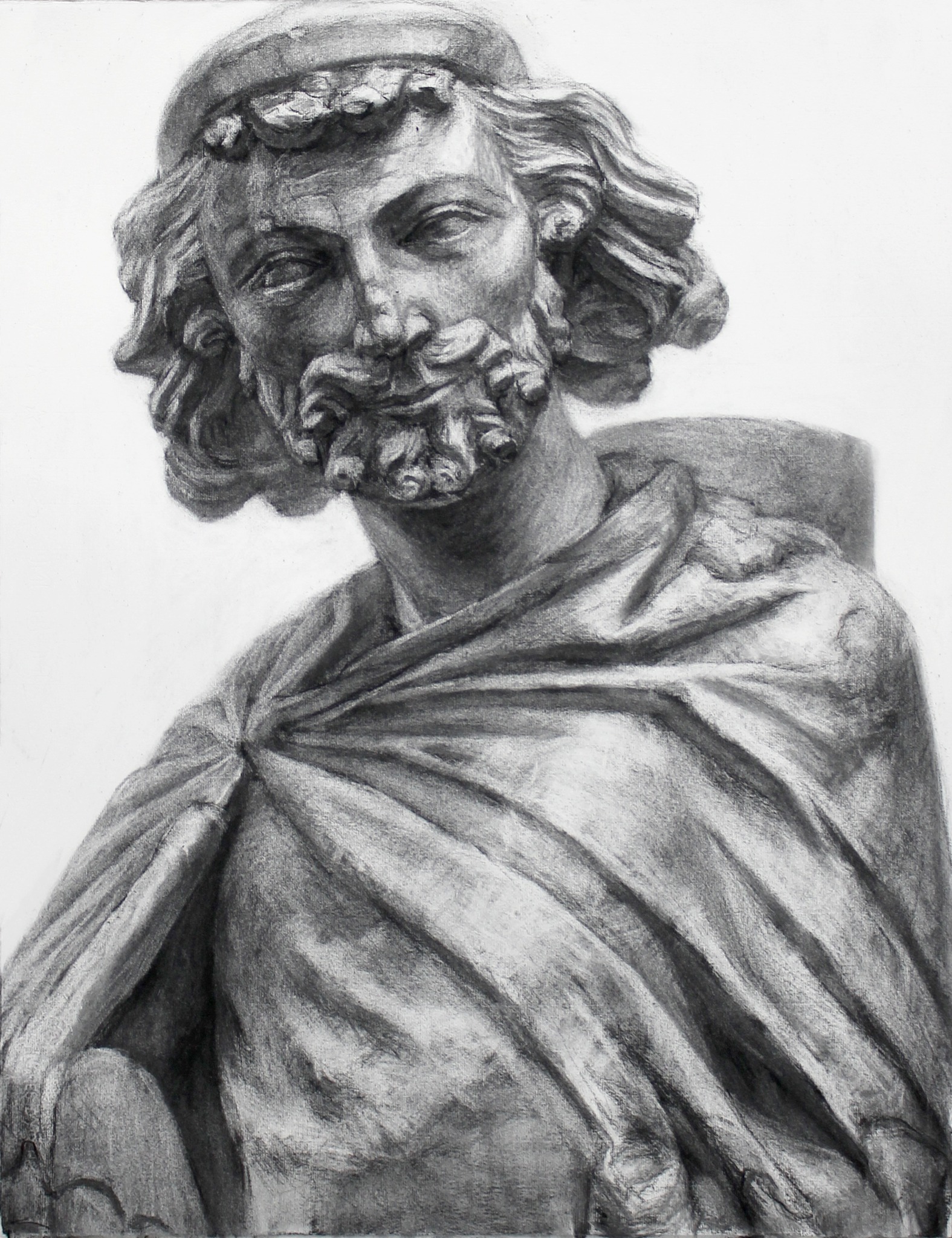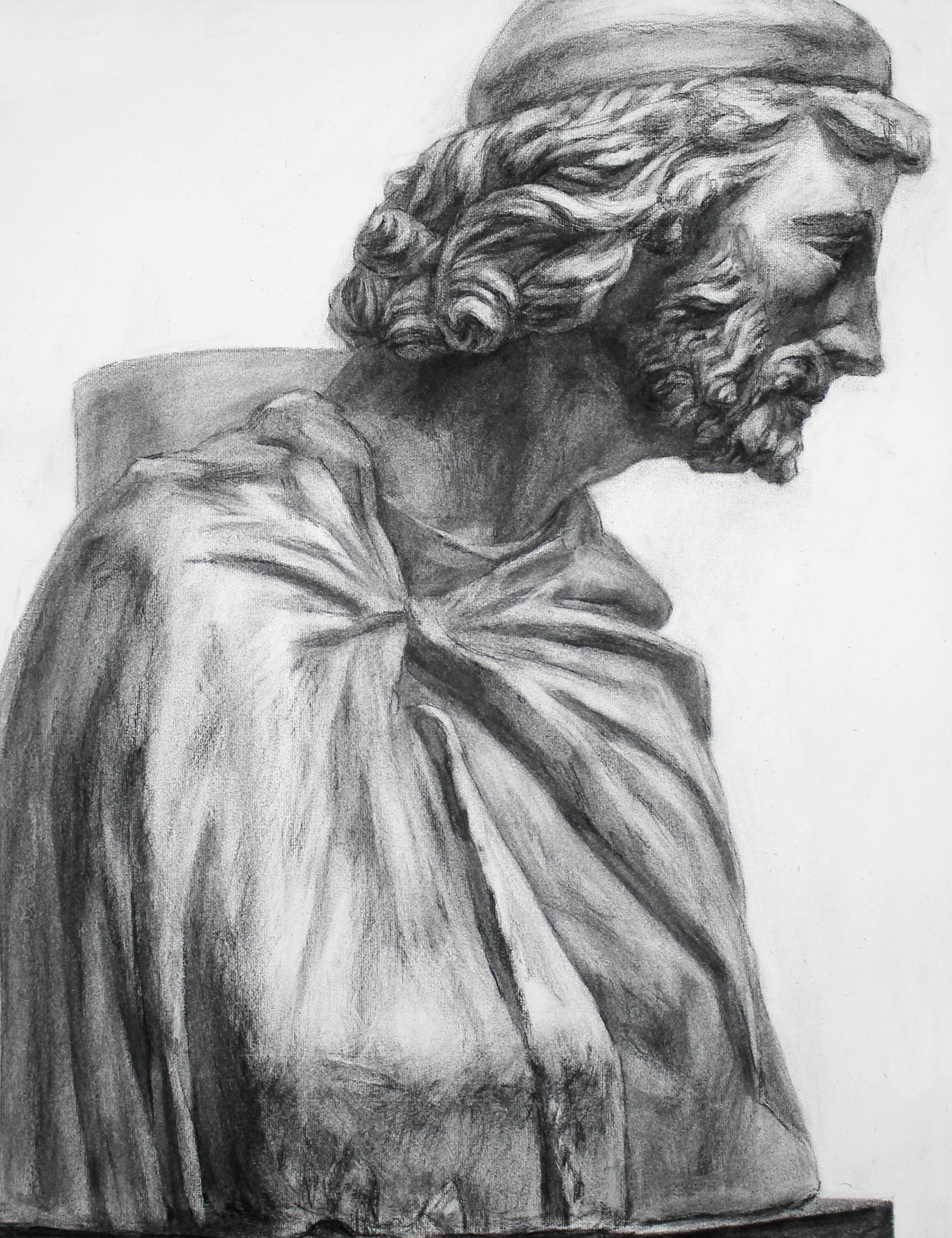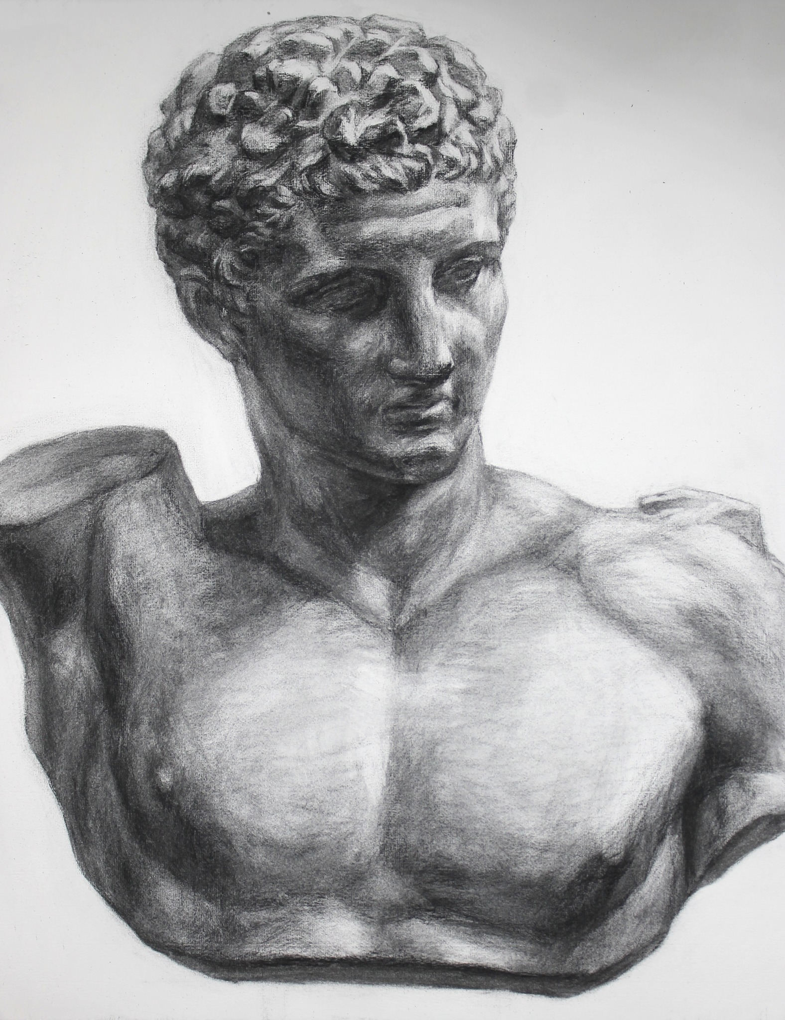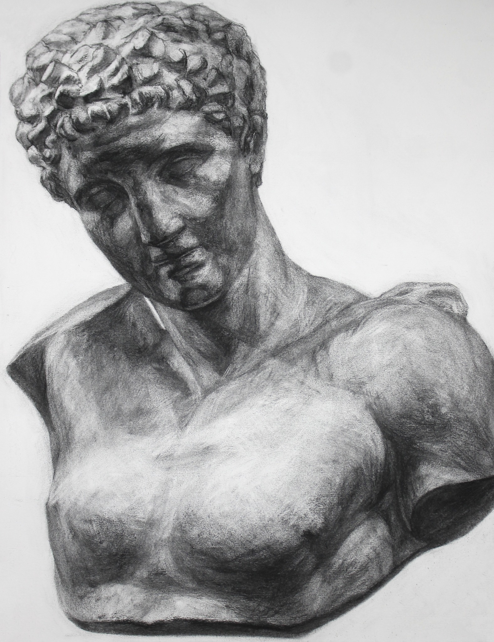 ヘルメス、難しい像ですね。体は柔らかく形がつながっていて捉えにくく、俯いているので顔は暗い、頭部は描写が大変!しかしとてもかっこいい像です。描くたびに発見があります。 描き出しでしっかり構造を意識して描きましょう。