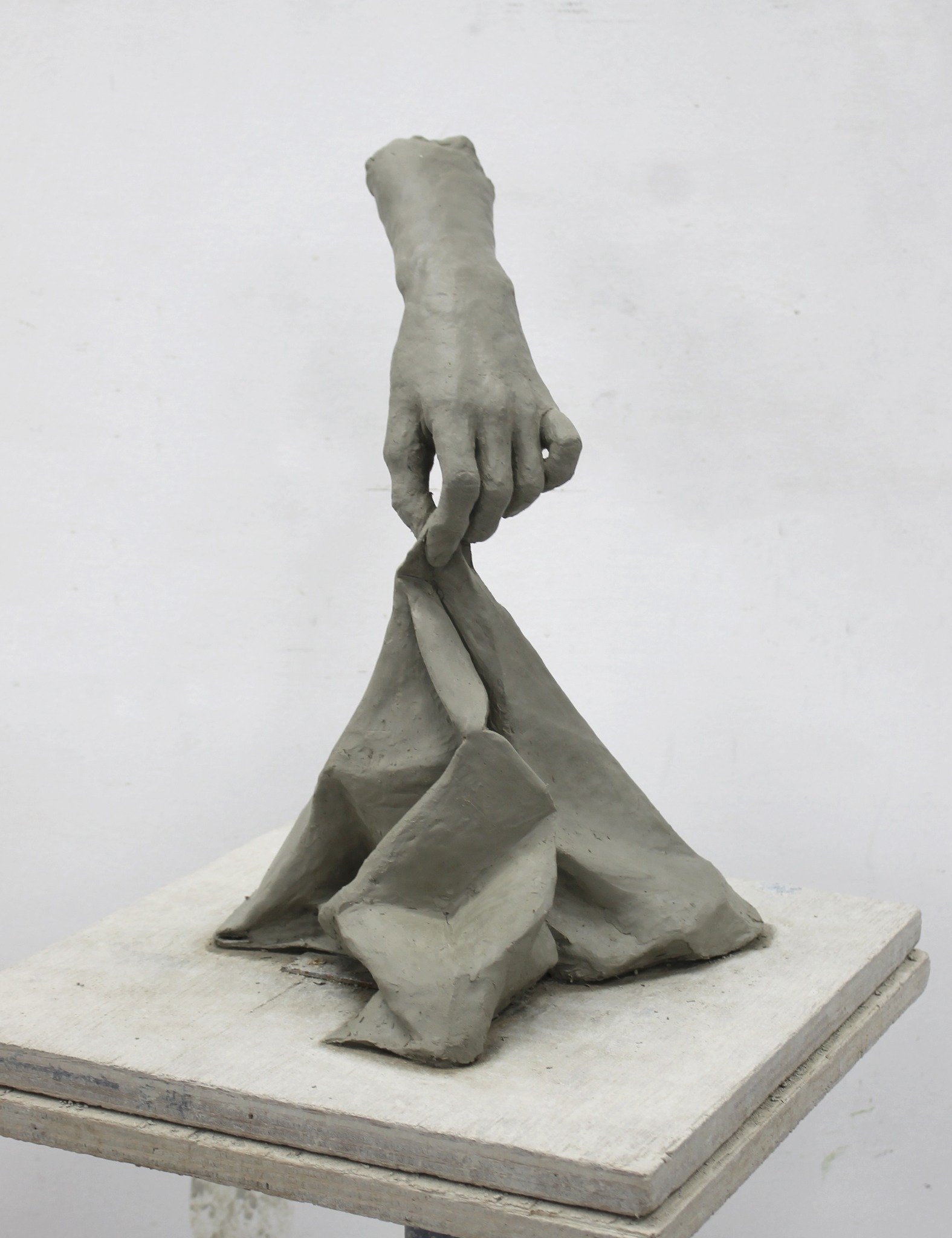 こちらは現役生の手と布の構成塑造です。指先の曲がり方に少し違和感が残ったものの、布の質感や手の自然さはとても良くできています。回した時にもかっこいい作品でした。