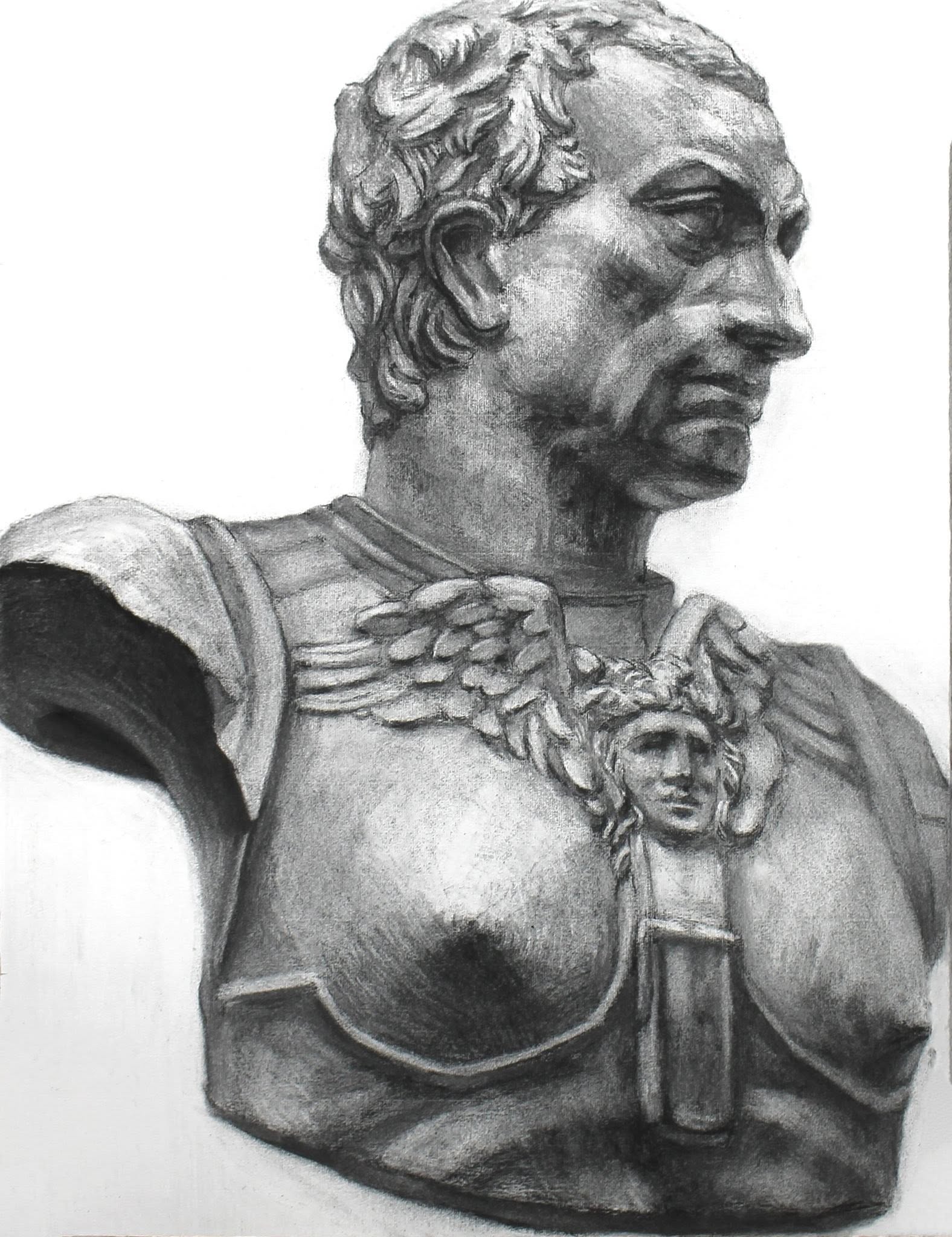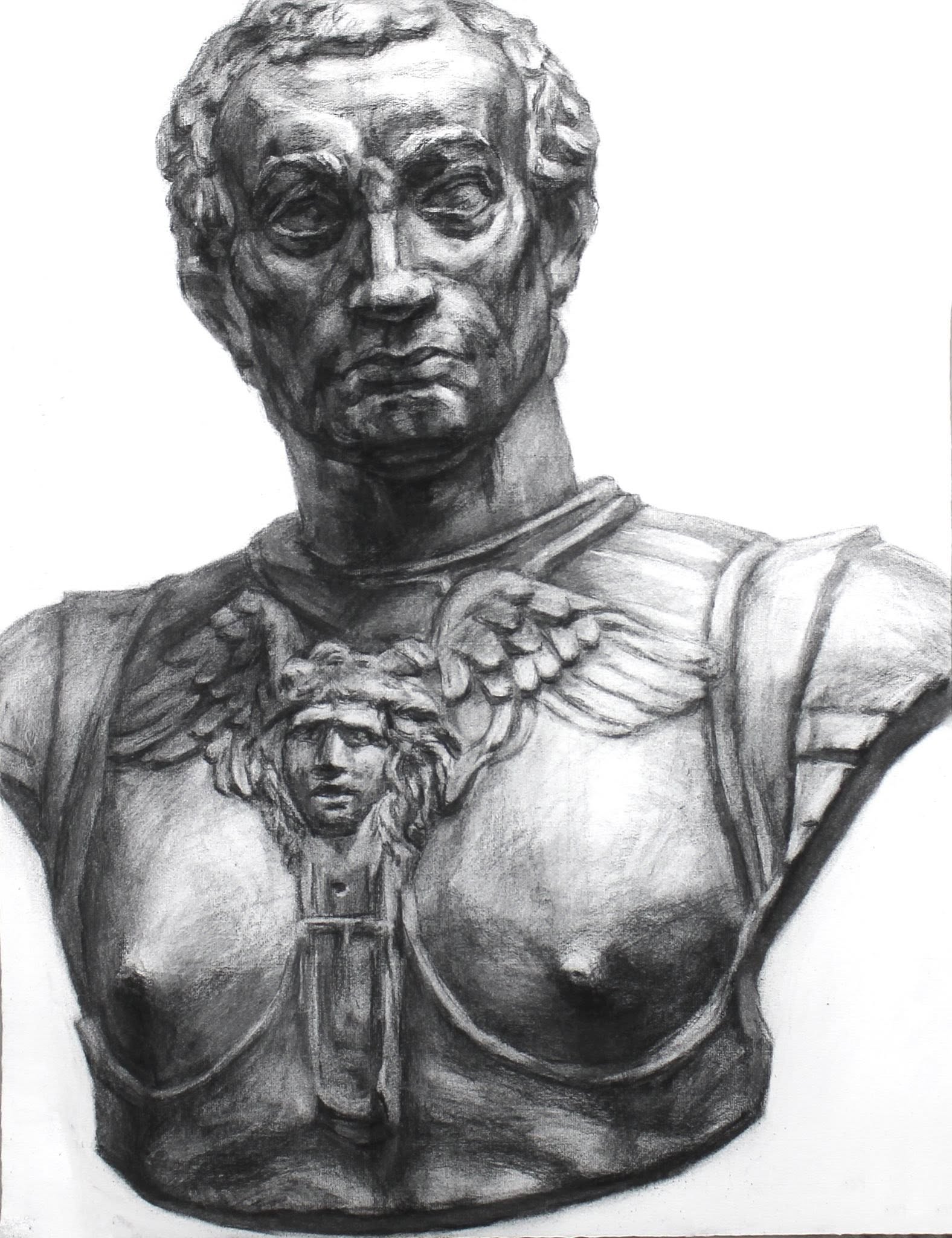 ガッタメラータは十字の構造が強い像なので、手前の肩→首→奥の肩、の空間(脇の位置も大事)がバチっと合うとかっこいいなと思います。本物は大きな騎馬像、独特の姿勢の感じは乗馬姿勢だったんですね。石膏像は大きな全身像をカットしているものが多いので(よく描くものの中で全体像なのはブルータスぐらいかな?)実物でどんなポーズ、立ち方をしているかは知っておくといいですね。特に重心なんかは上手い人が見れば違いが一目でわかっちゃいます。
