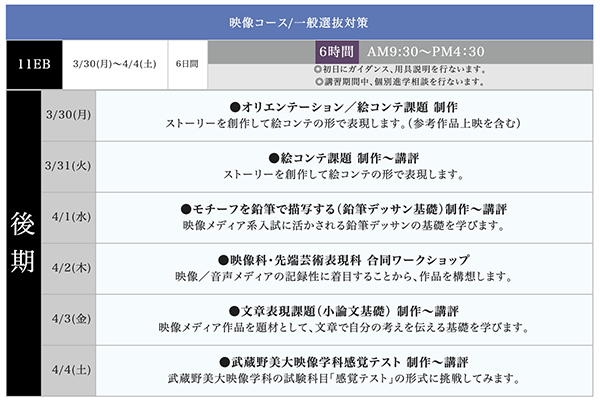 時間はいずれも9:30〜16:30です。既に映像科の受験対策を始めている人はもちろんですが、完全にこの春が初めての人も対象にしています(初日に詳しい説明をするのでご心配なく…!)